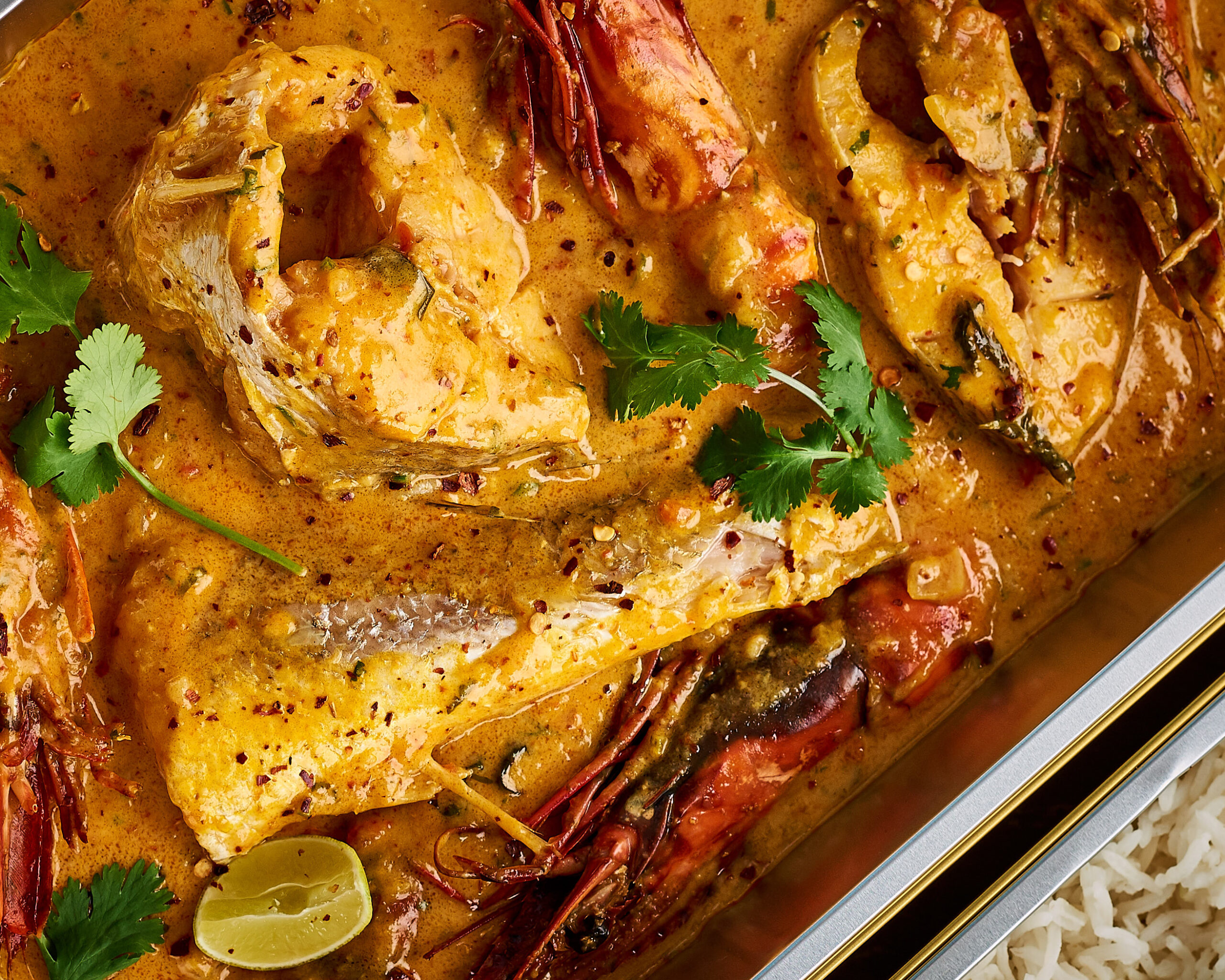 Brazilian curry with fresh fish and prawns, served with basmati white rice